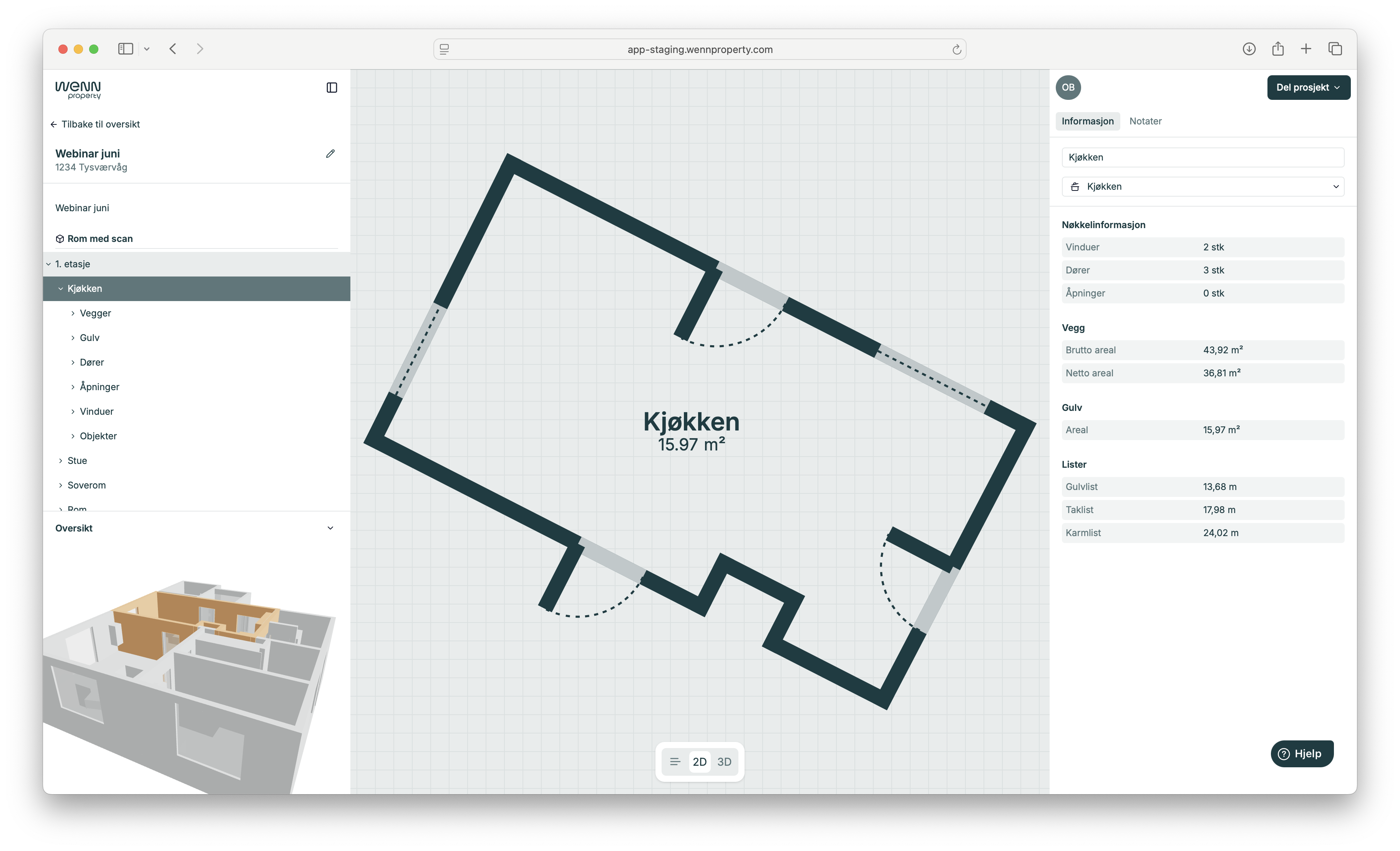 Trykk på rom i plantegningen for å se detaljer i høyre panel.